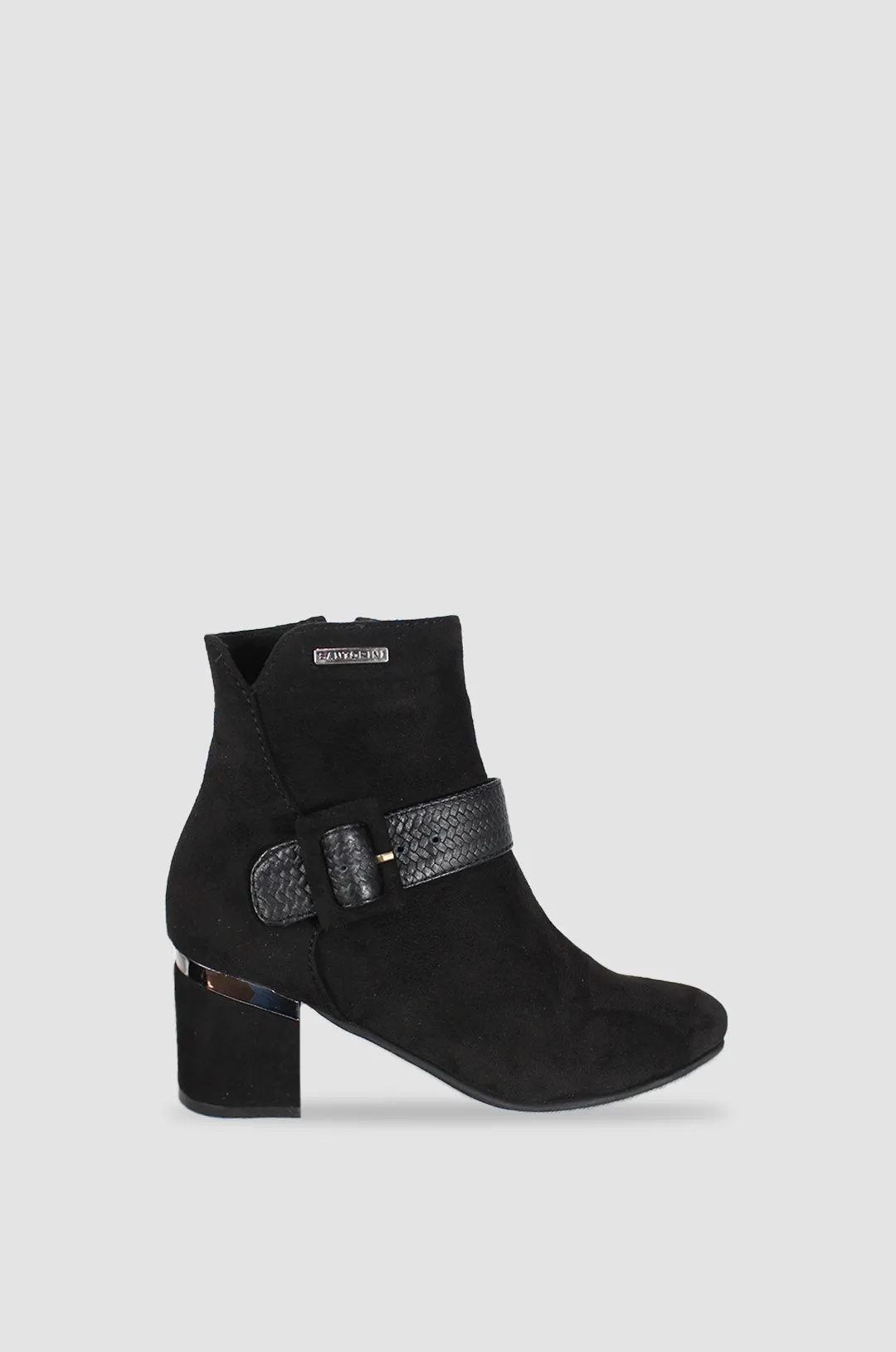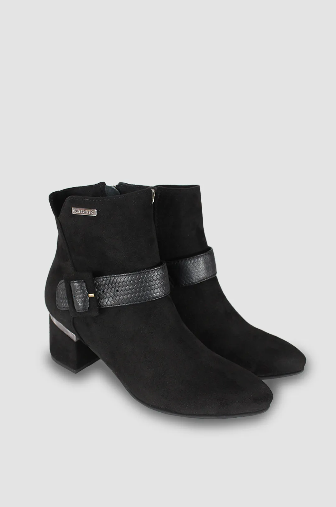 Botines negros de mujer con diseño elegante y casual. Cuentan con una hebilla decorativa con textura y tacón bloque, perfectos para cualquier ocasión.