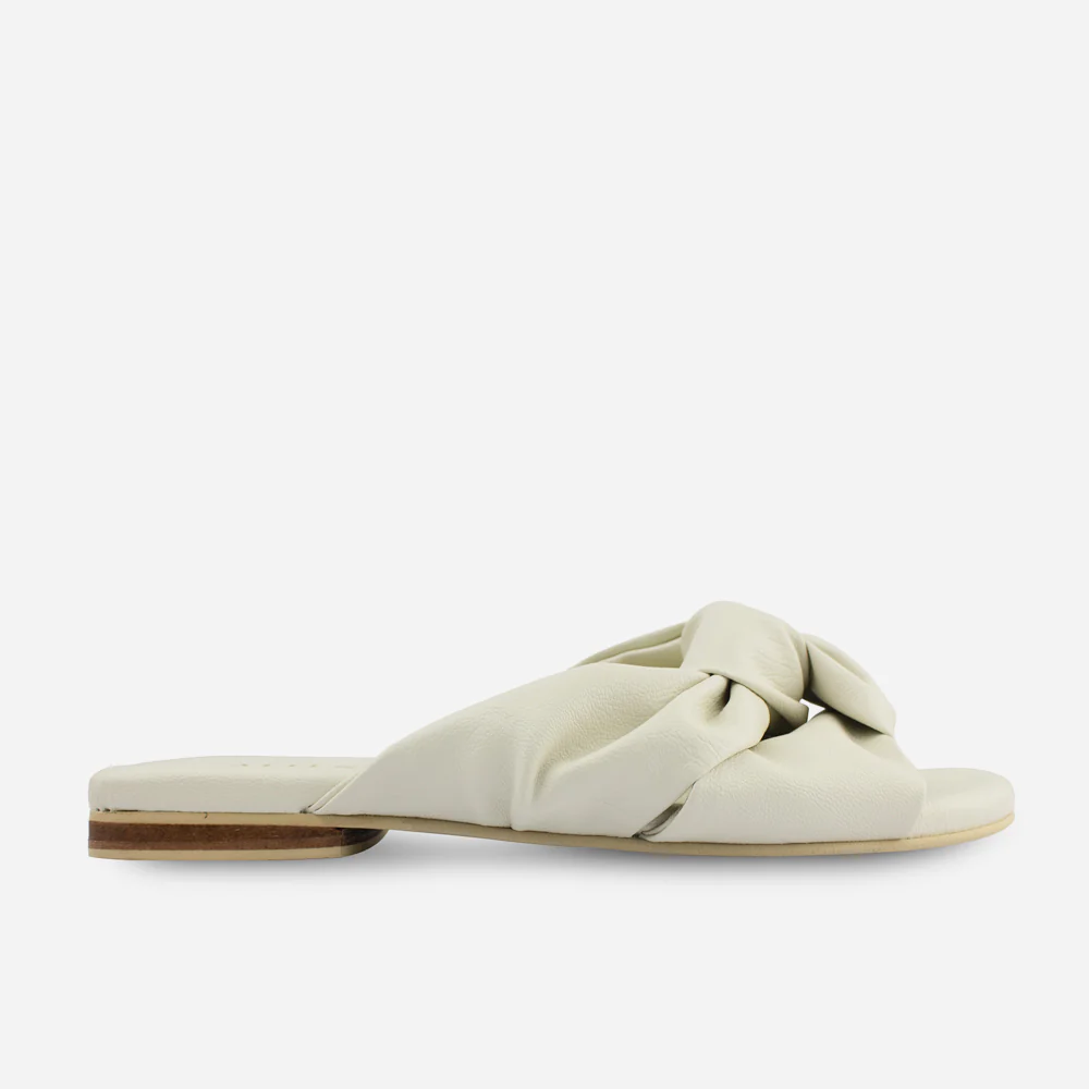 Sandalia plana color crema con un elegante detalle de nudo fruncido. Perfecta para un look casual y cómodo en verano.