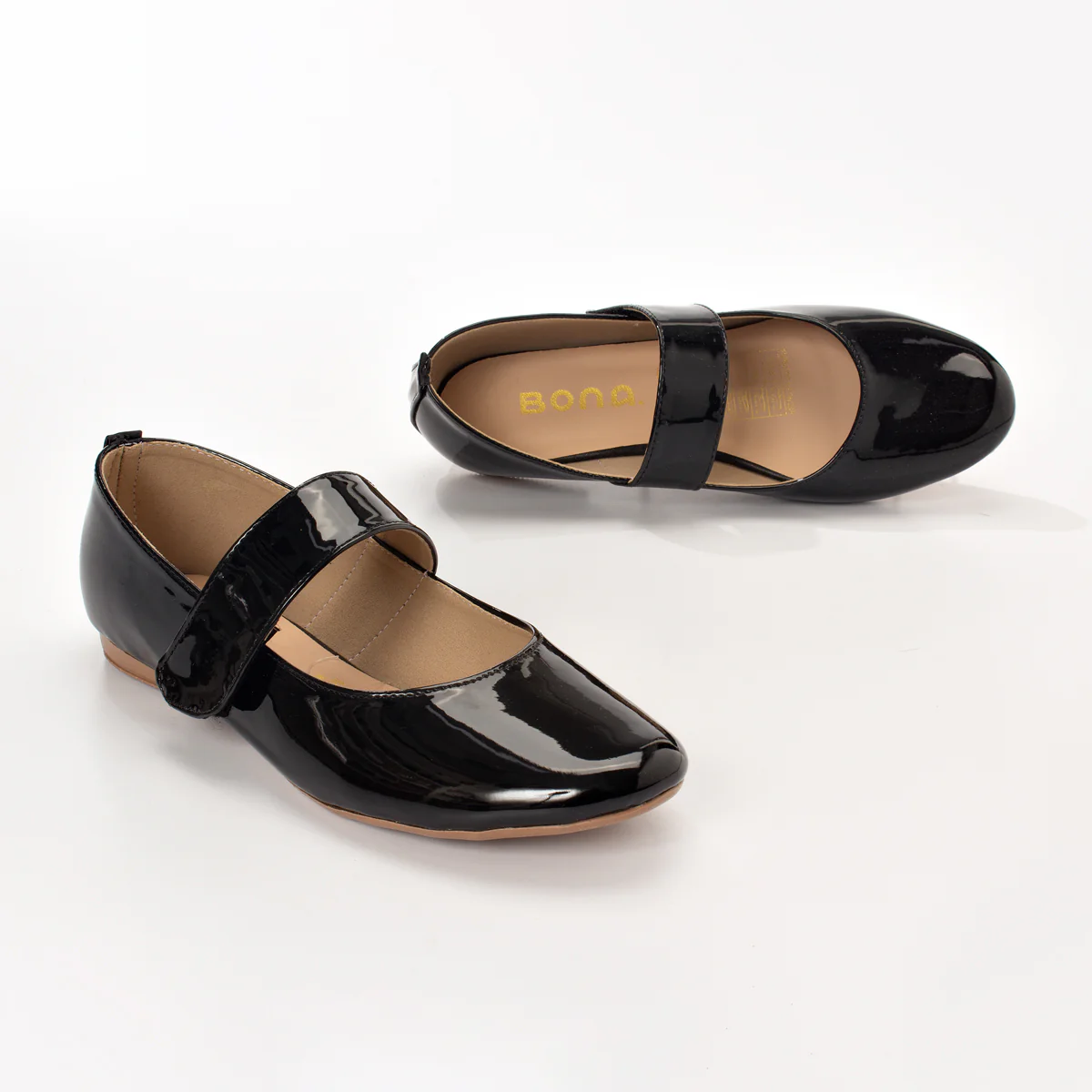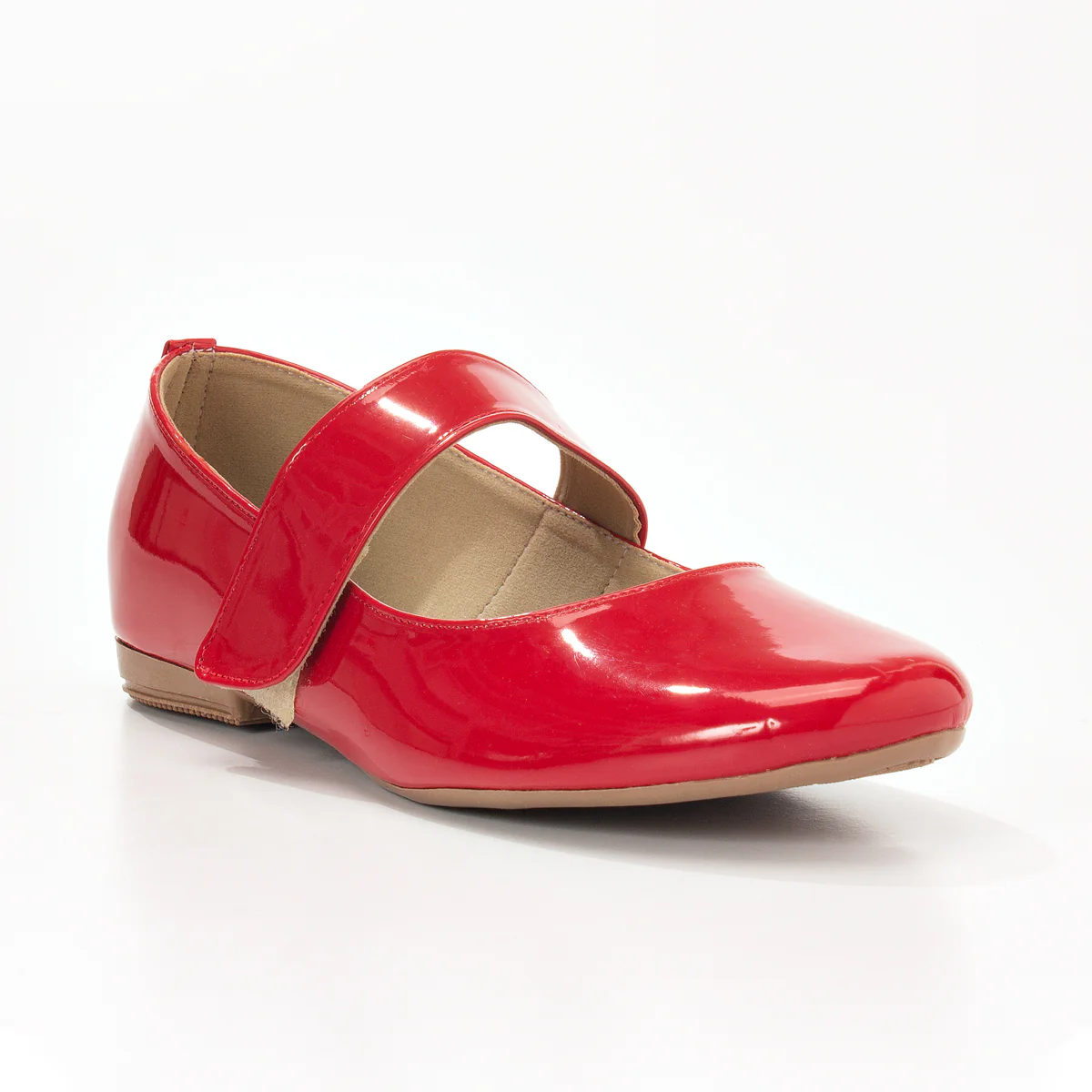 Elegantes bailarinas estilo Mary Jane en charol beige. Perfectas para un look clásico y cómodo, con cierre de velcro para un ajuste seguro.