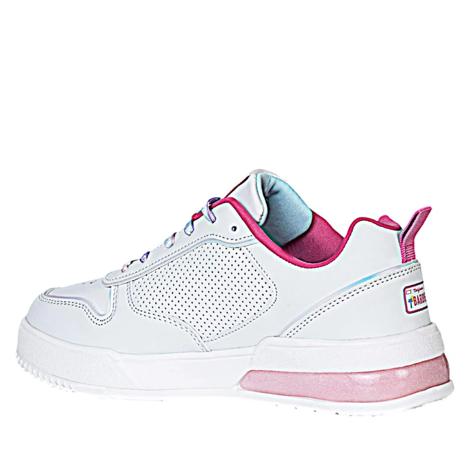Tenis Barbie de edición limitada en color blanco con detalles vibrantes en rosa fucsia y cordones iridiscentes, perfectos para un look casual y con estilo.