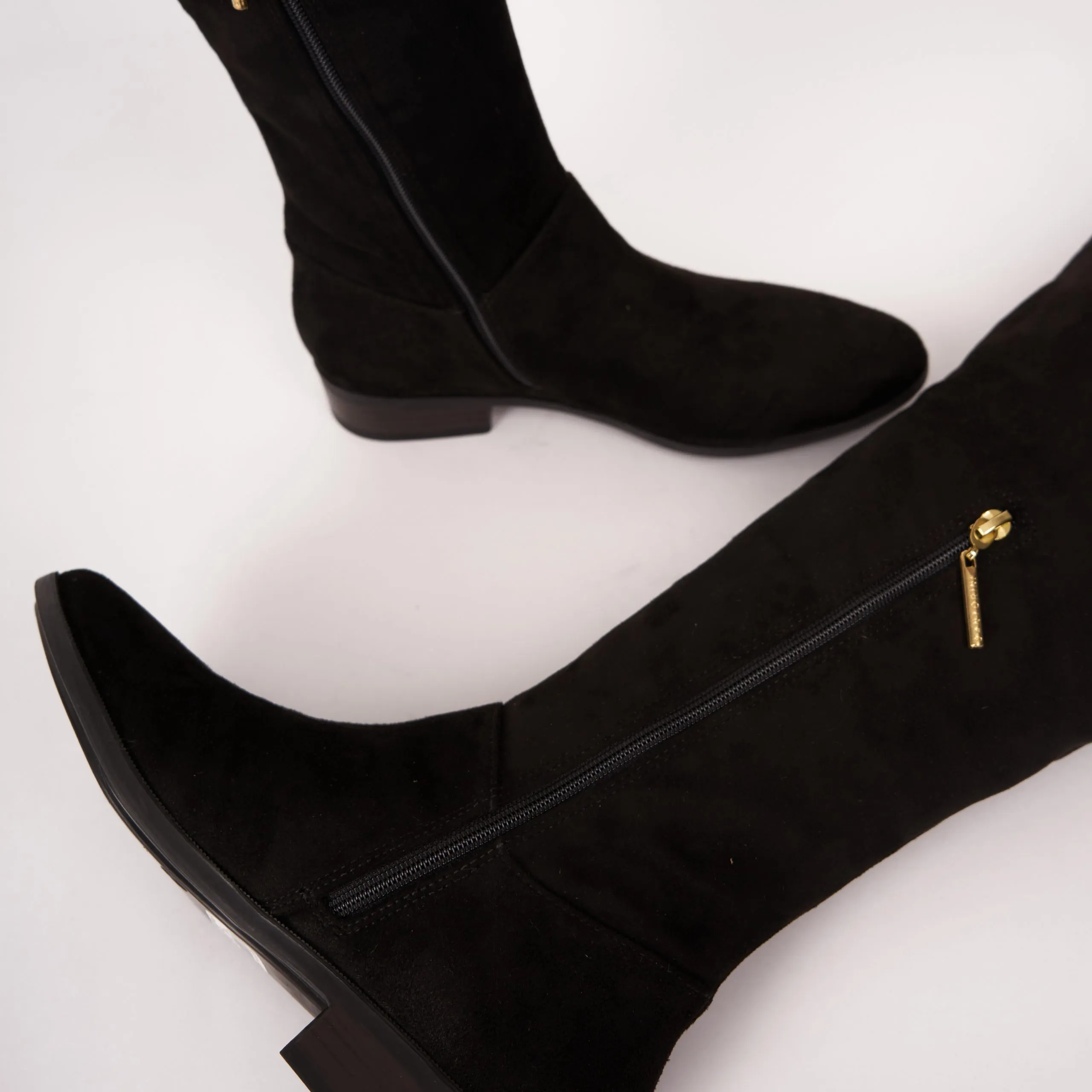 Botas bucaneras negras de gamuza, ideales para un look elegante y sofisticado. Diseño sobre la rodilla con cierre lateral dorado y tacón bajo.