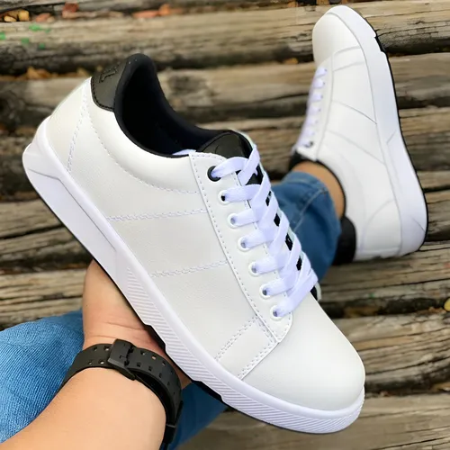 Zapatillas urbanas blancas unisex con suela de plataforma y detalle trasero negro, ideales para un look moderno y cómodo en cualquier ocasión. Perfectas para añadir un toque de estilo a tu atuendo diario.