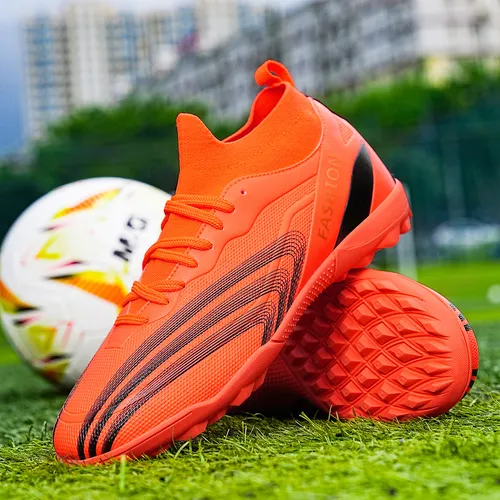 Botines de fútbol Fila en un audaz diseño dorado y negro con detalles en naranja vibrante, ideales para un rendimiento superior en el campo con estilo y comodidad.