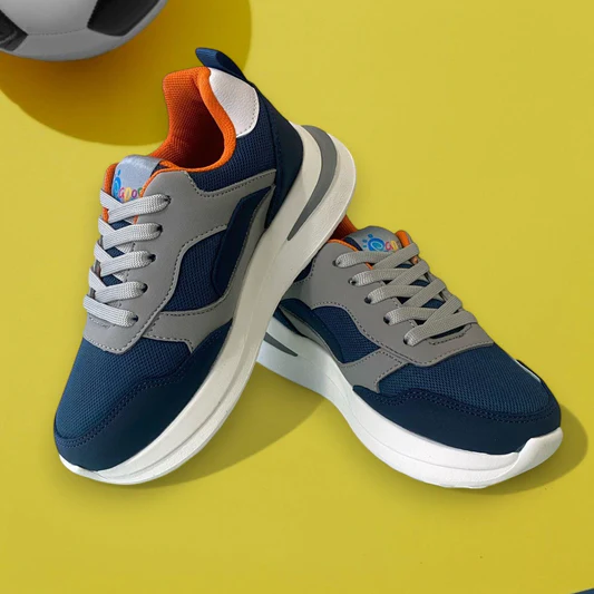 Zapatillas deportivas para niño en tonos azul marino y celeste, con cierre de velcro y cordones. Suela blanca antideslizante para máximo confort y seguridad en el día a día. Ideales para juegos y actividades escolares.